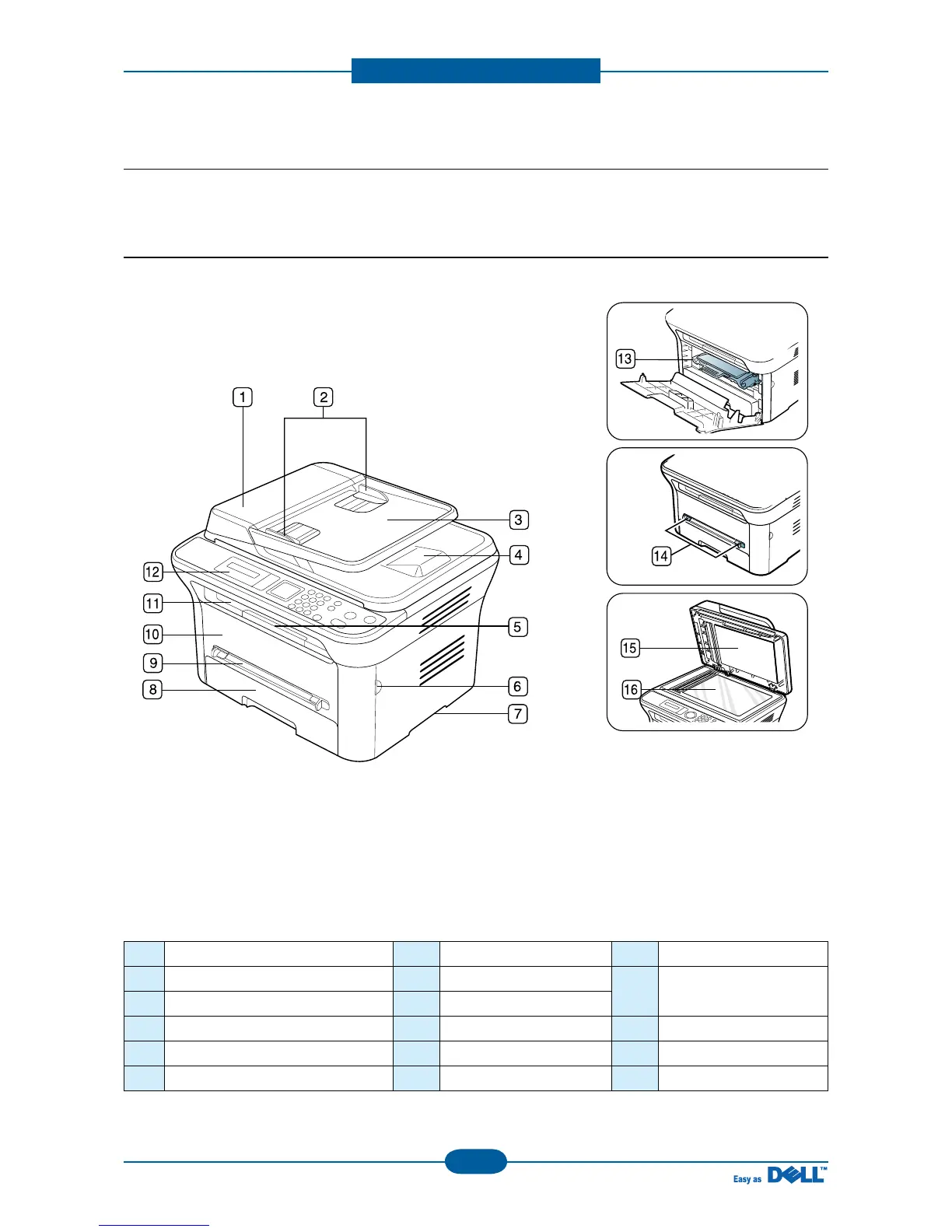 4 Document feeder output tray 10 Front door 15 Scanner lid
