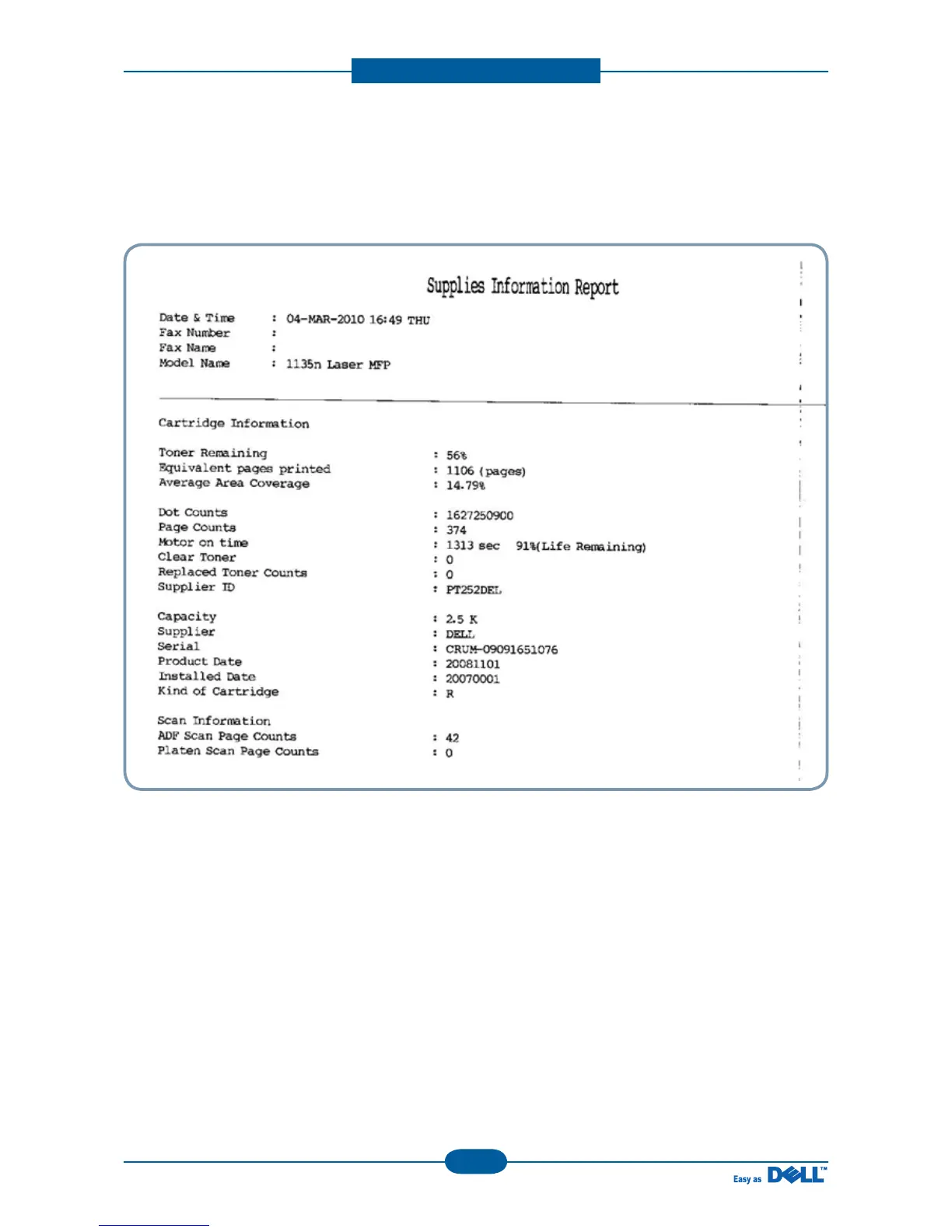 This report shows the status of toner cartridge. This report includes toner remaining, average area coverage,