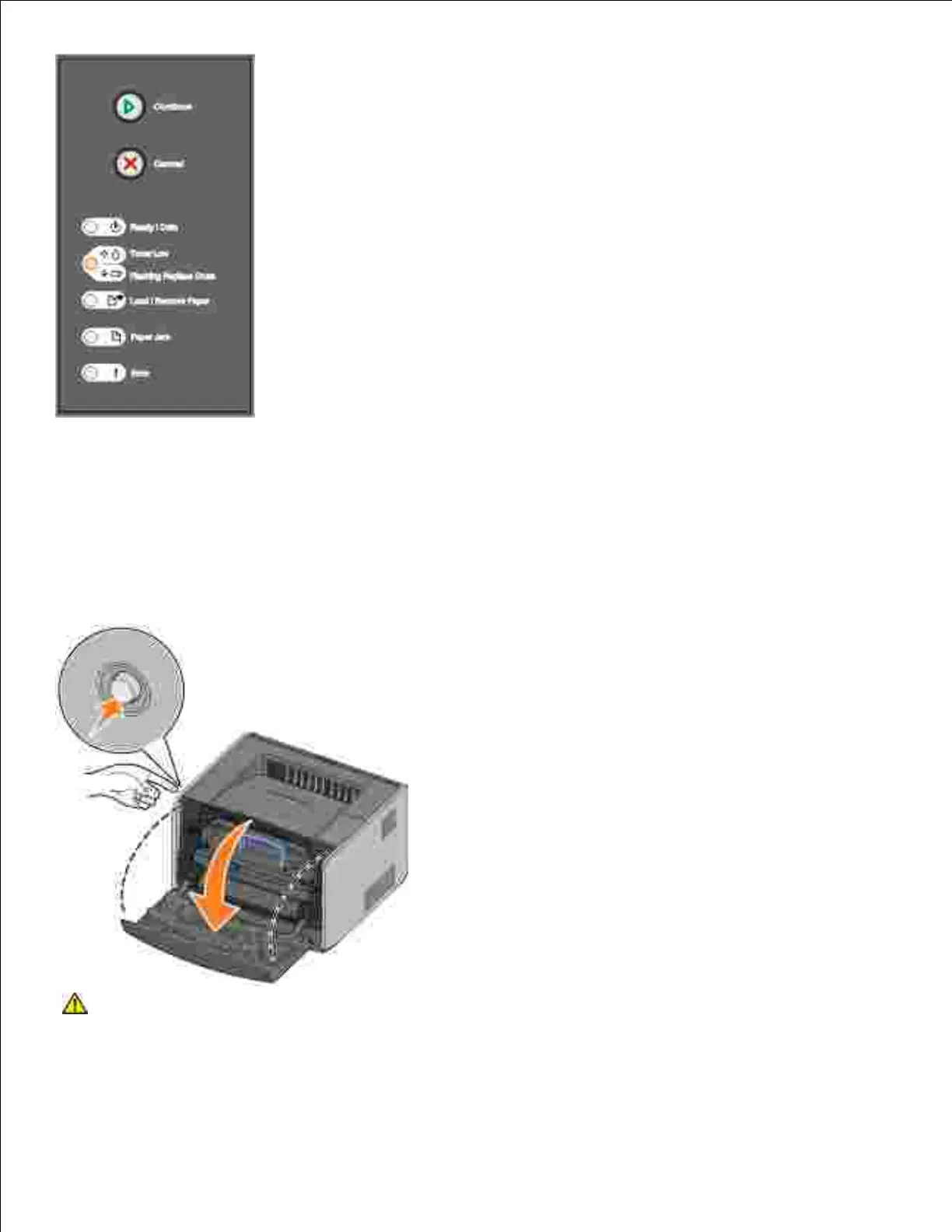 Open the front cover by pressing the button on the left side of the printer and lowering the cover.1.