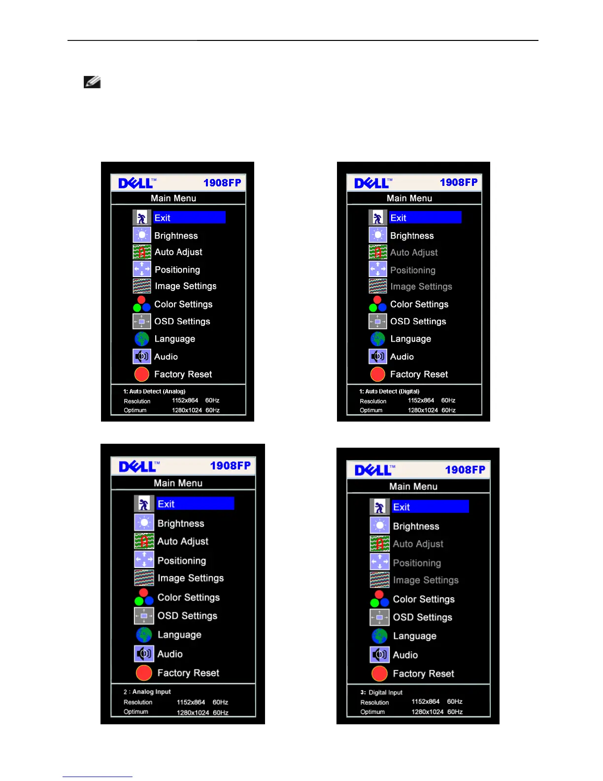 Main Menu for Analog (VGA) Input Main Menu for Digital (DVI) Input