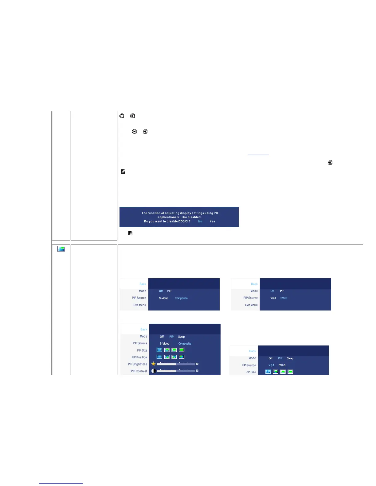 PIP submenu when PIP OFF (main source is VGA/DVI-D input) PIP submenu when PIP OFF (main source is Video input)