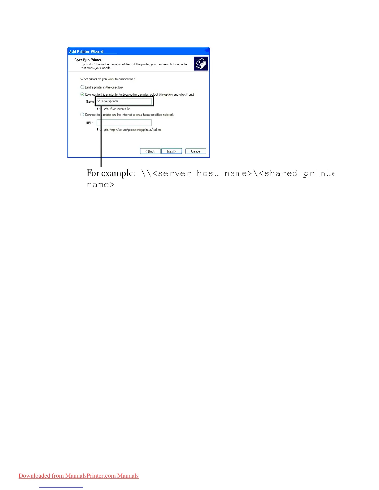 that I want isn't listed and type in the path of the printer in the Select a shared printer by name text box and click Next.