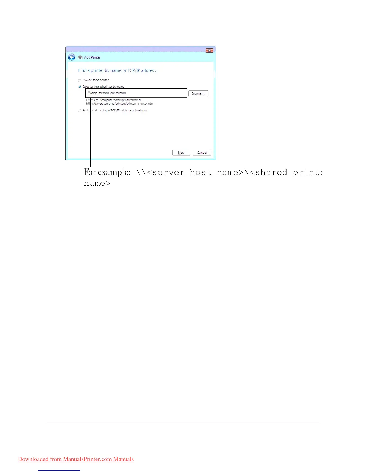 shared printer by name text box and click Next.