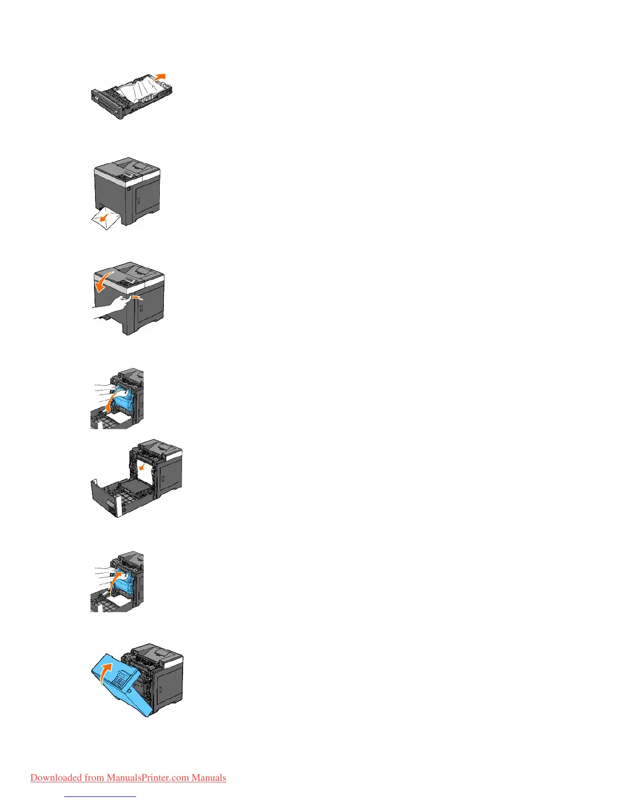 5. Open the belt unit until it stops and remove the jammed paper. Then, confirm that there are no scraps of paper remaining inside the printer.