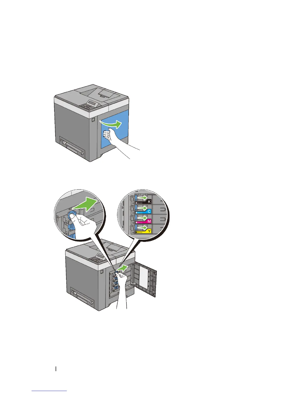 Push the latch(es) backwards to pop open the toner cartridge(s) that you want