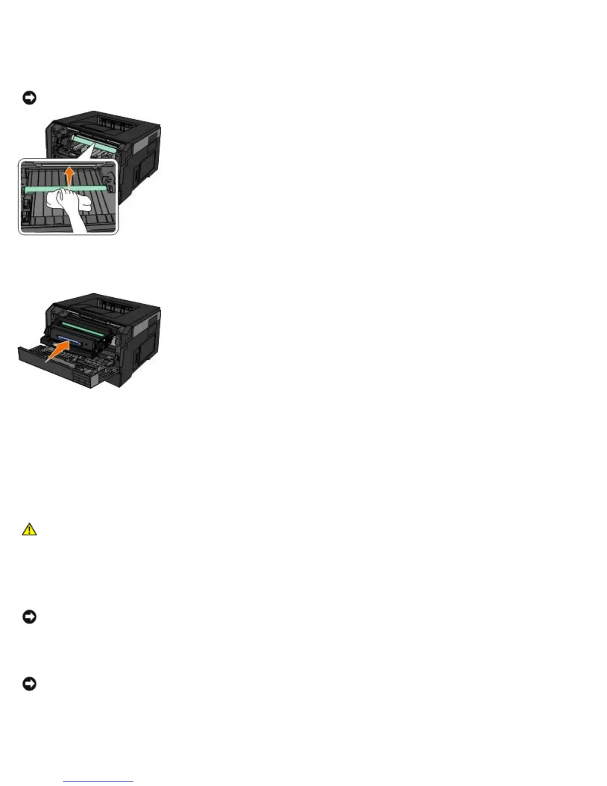 blue arrows found in the printer and pushing the imaging drum into the printer as far as it will go. The imaging drum