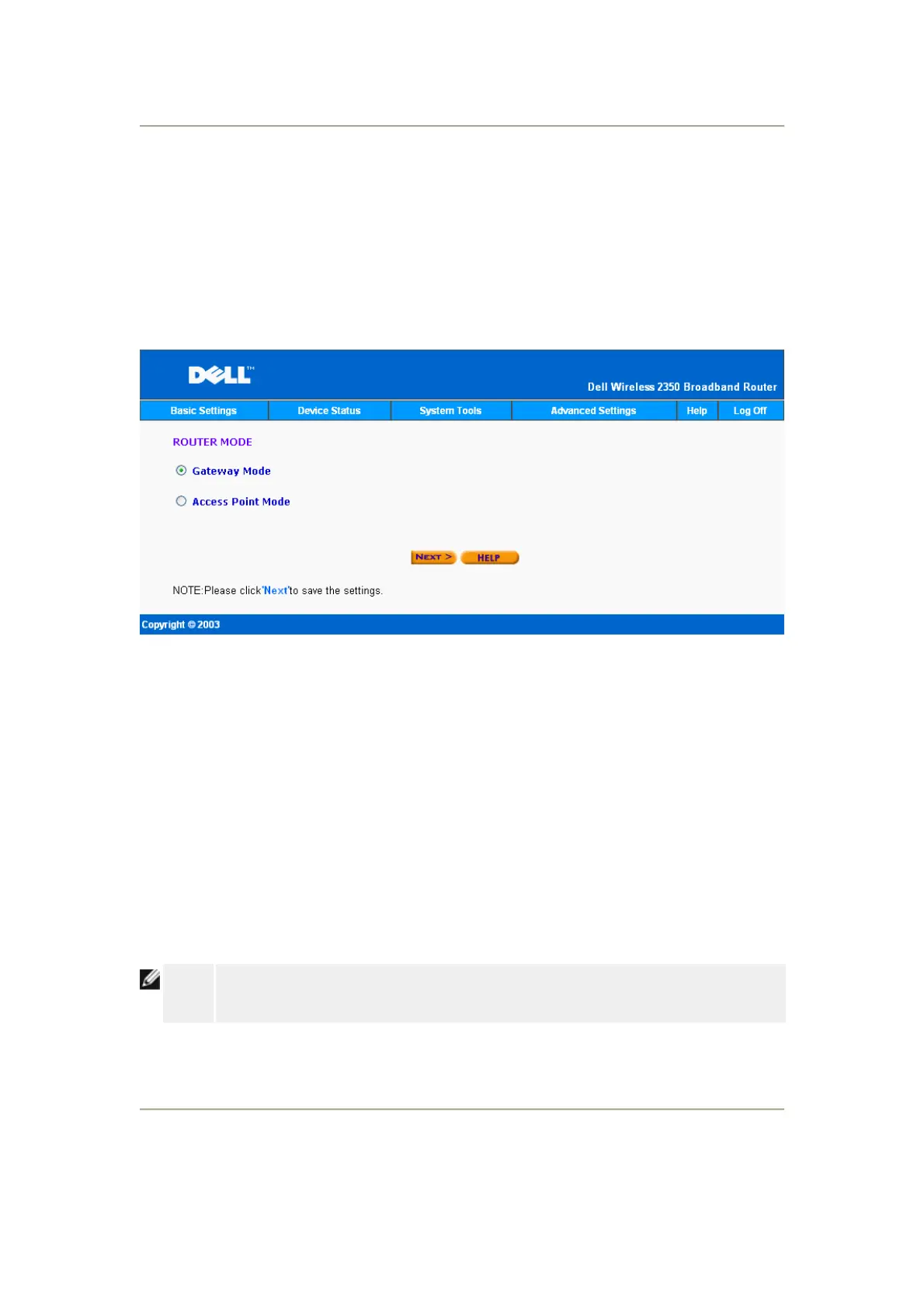 The Dell Wireless 2350 has two operating modes: Gateway mode and Access Point mode.
