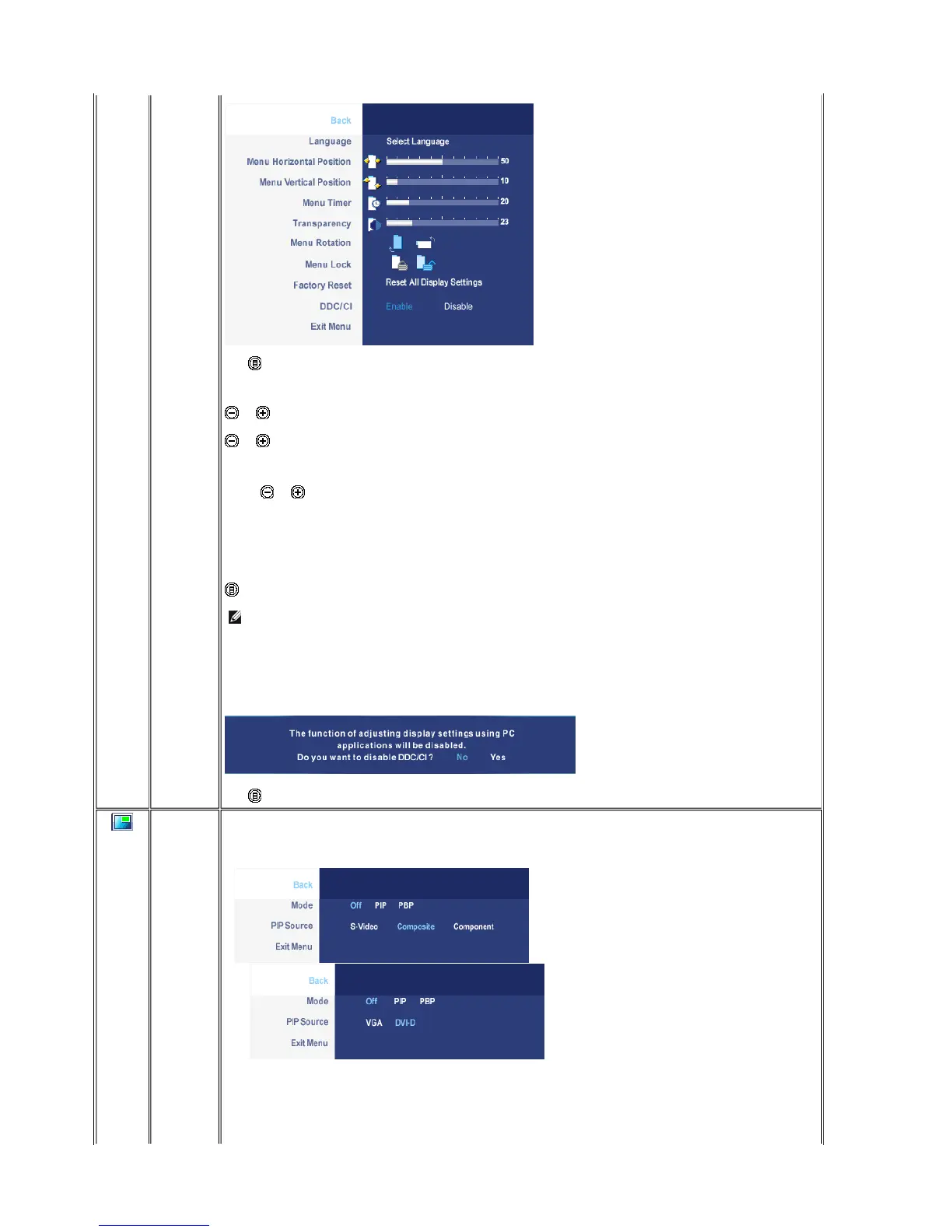 PIP/PBP submenu when PIP/PBP ON(main source is VGA/DVI-D input) PIP/PBP submenu when PIP/PBP ON