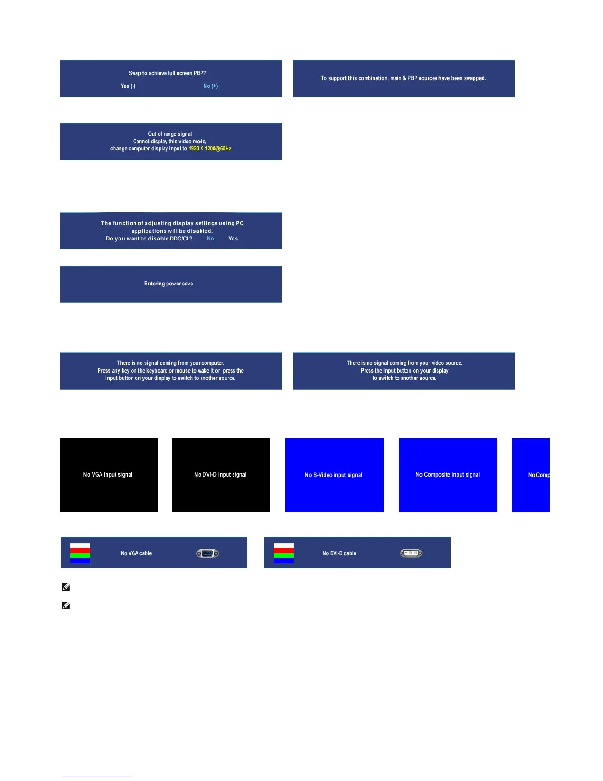 In PIP mode, when the monitor does not sense the selected second signal input, one of the following messages will appear depending upon the selected input as