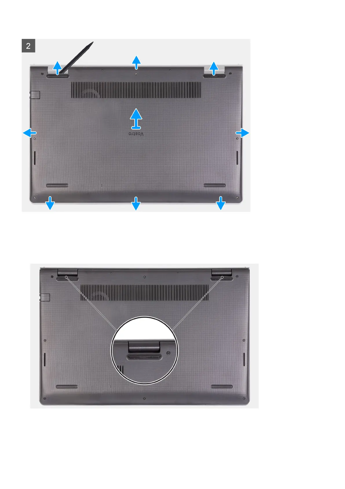 3. Pry open the base cover starting from the recesses located in the U-shaped indents at the top edge of the base cover near