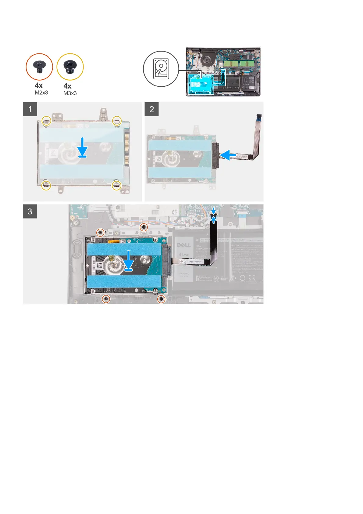 2. Install the four (M3x3) screws to secure the hard drive to the hard-drive bracket.