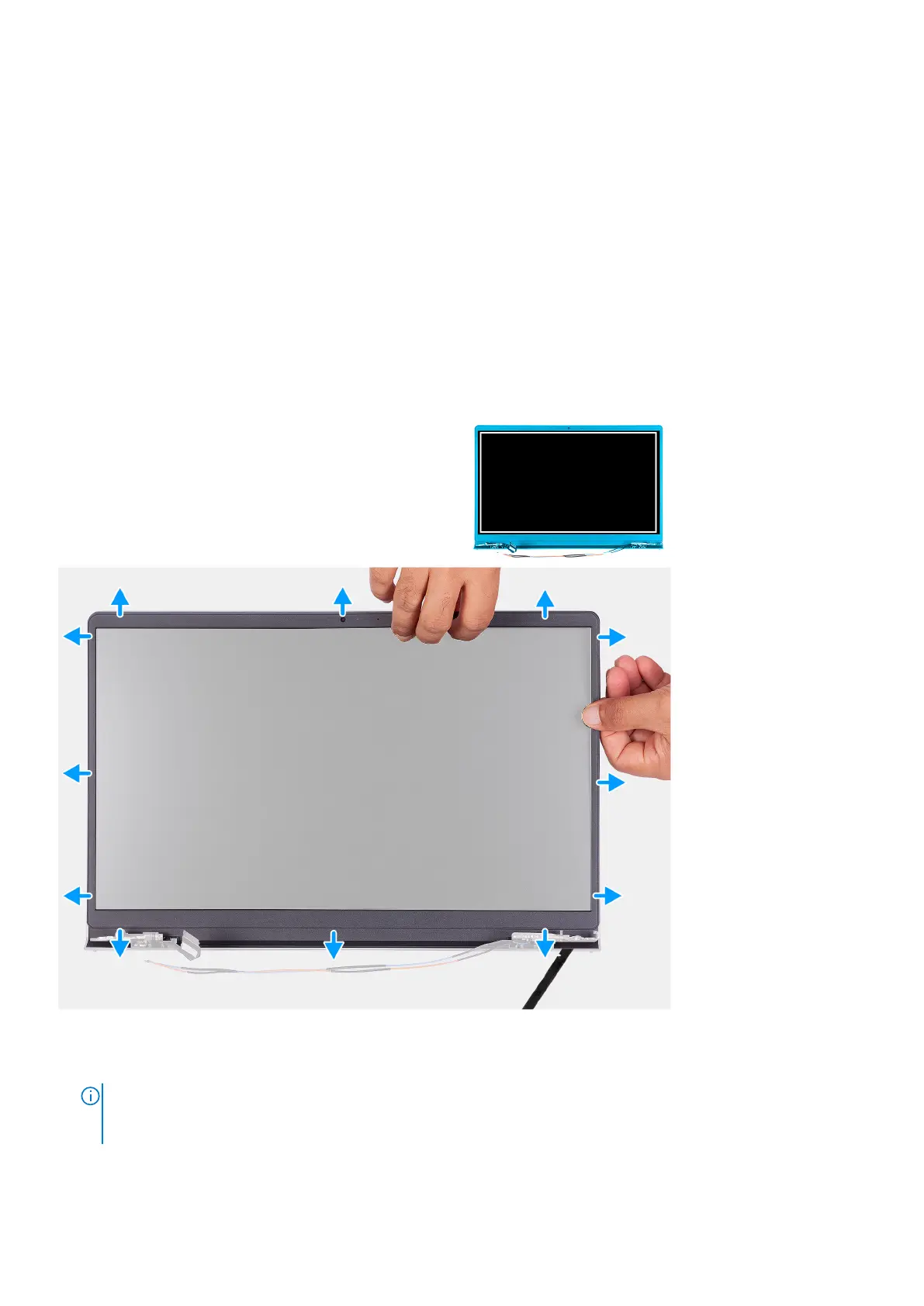 hinge caps to start the prying process to release the display bezel. Pry along the outside edge of the display bezel and
