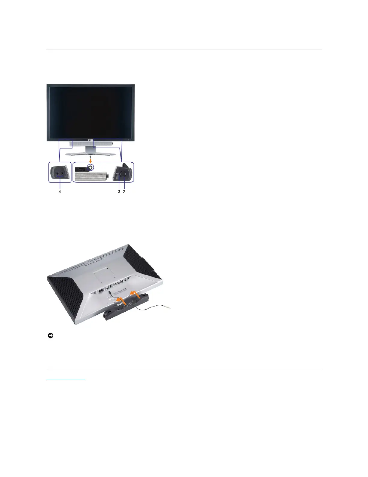 The Dell Soundbar is a four-speaker, two-channelspeakerthatcanbeattachedtoyourmonitor.LocatedontheSoundbararea:Rotaryvolumeandon/off