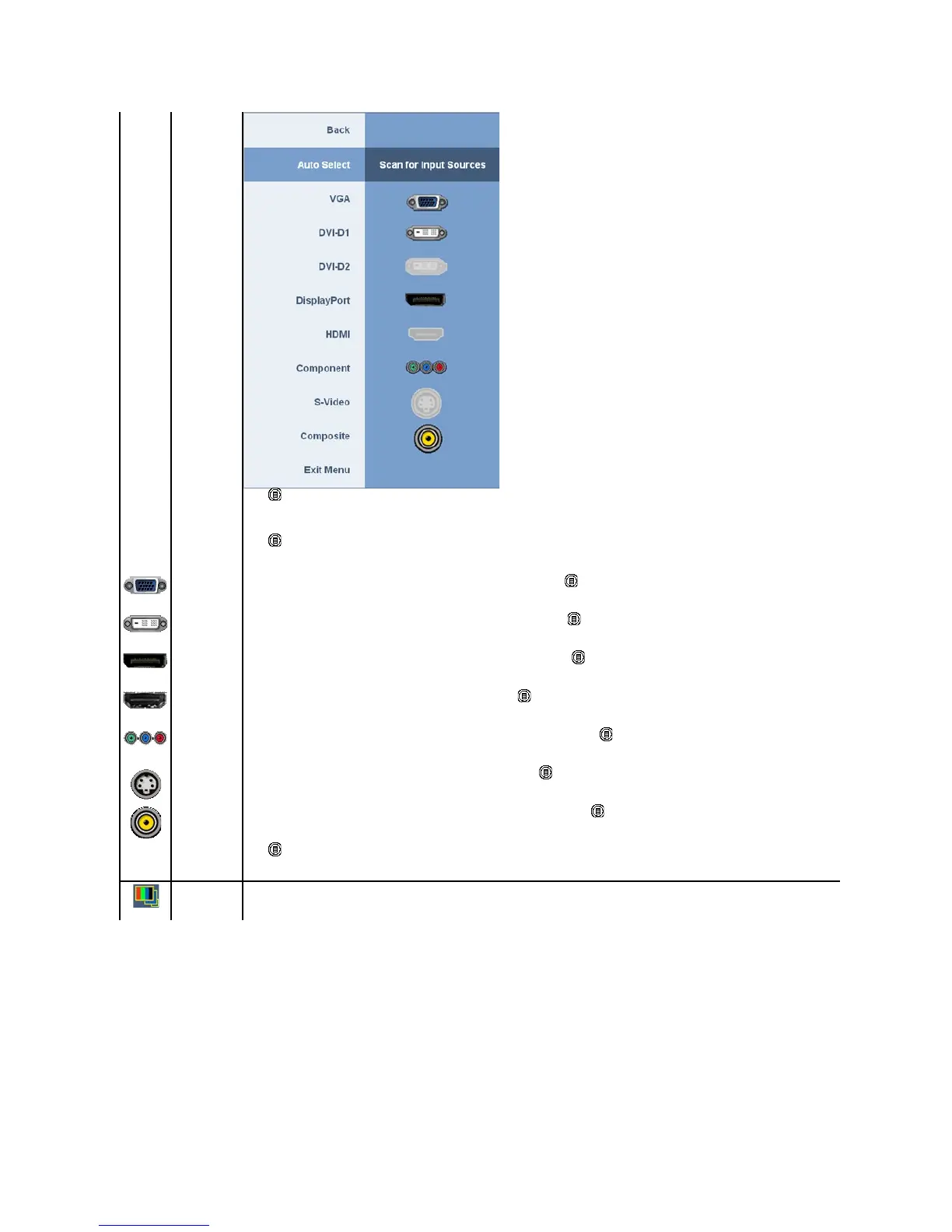 Select DisplayPort input when you are using DisplayPort connector. Push to select the DisplayPort input source.