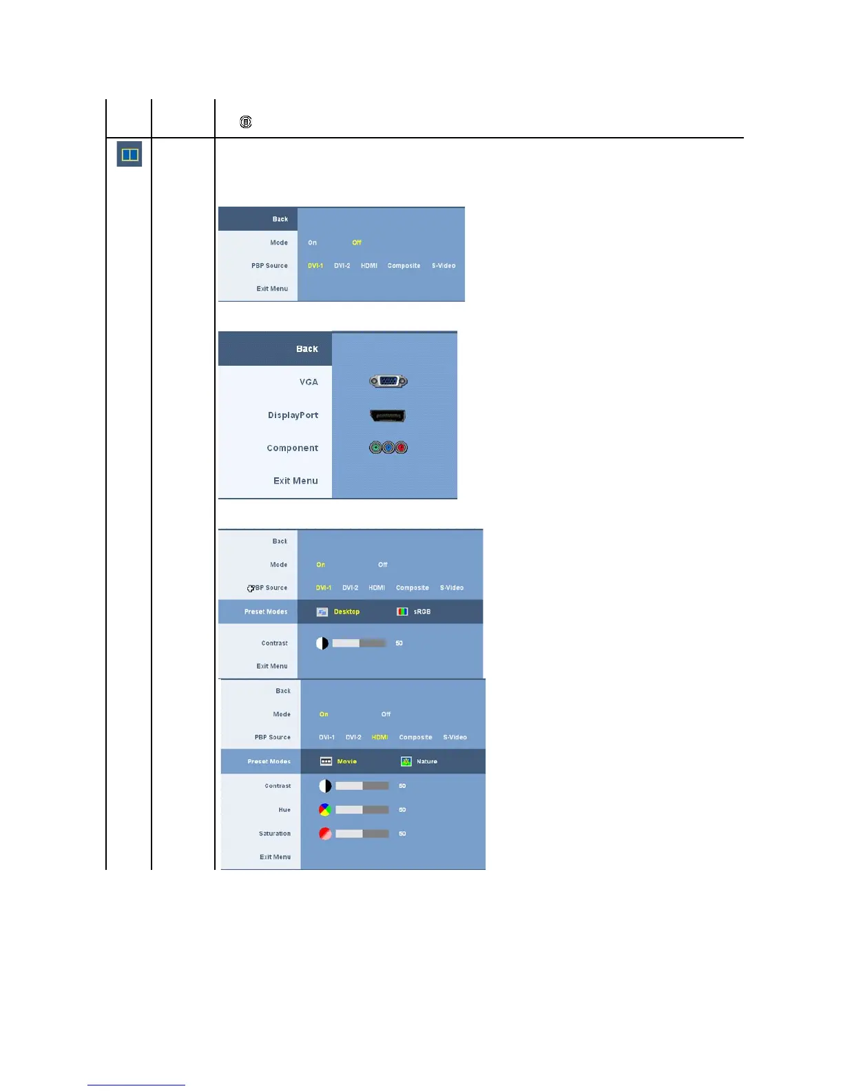 Picture by Picture (PBP) submenu when Picture by Picture (PBP) ON (Second source is DVI or HDMI or Composite or S-