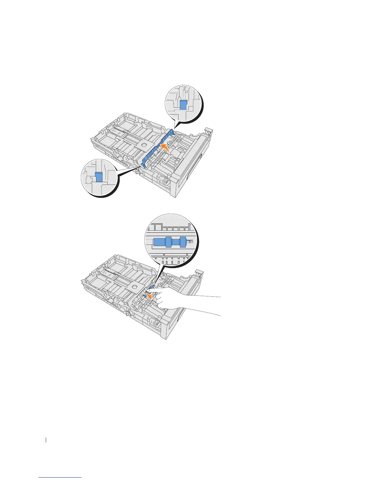 Push back the handles on each side of the separator roller cover as shown in the following