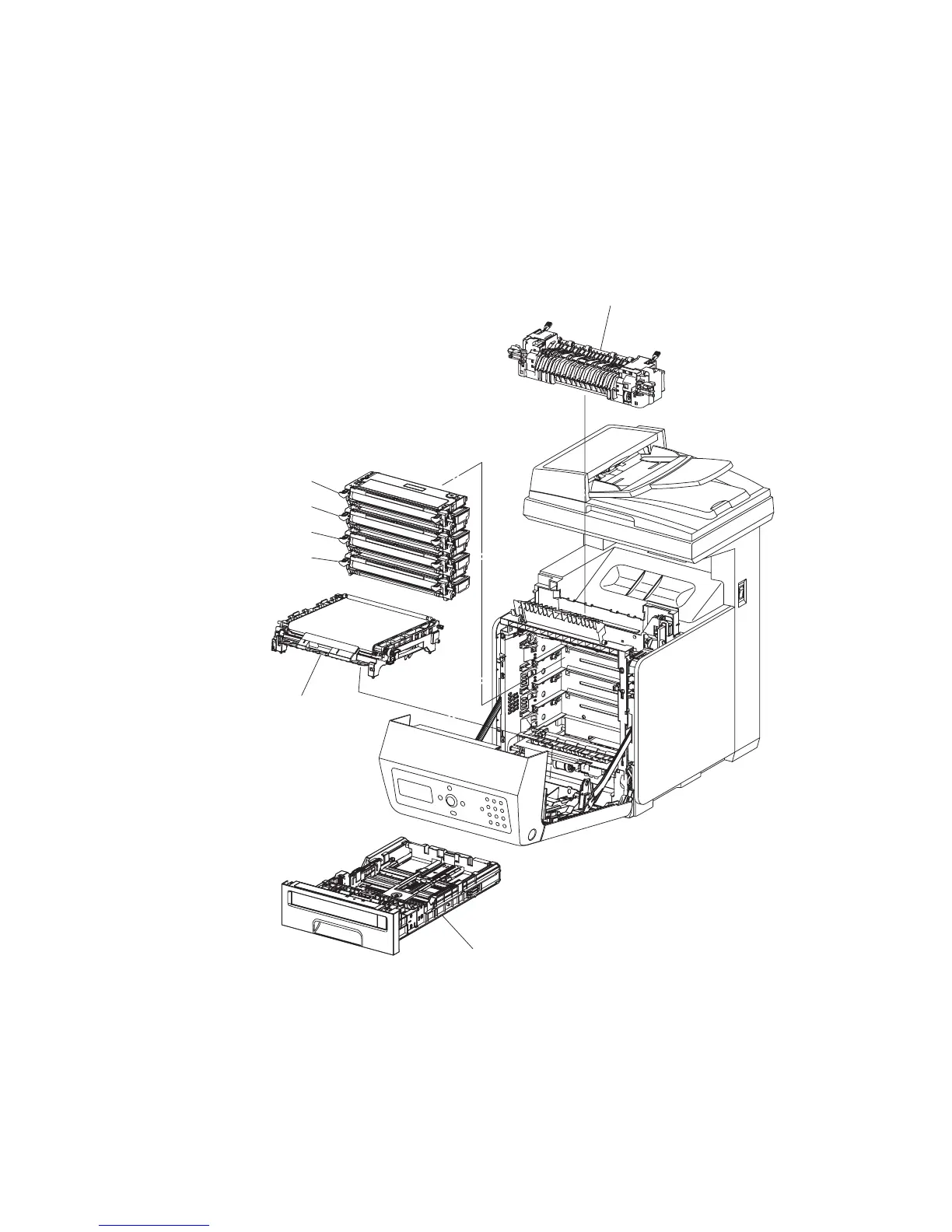 - Remove PAPER TRAY, TRANSFER BELT, TONER CARTRIDGE, and FUSER, and put them