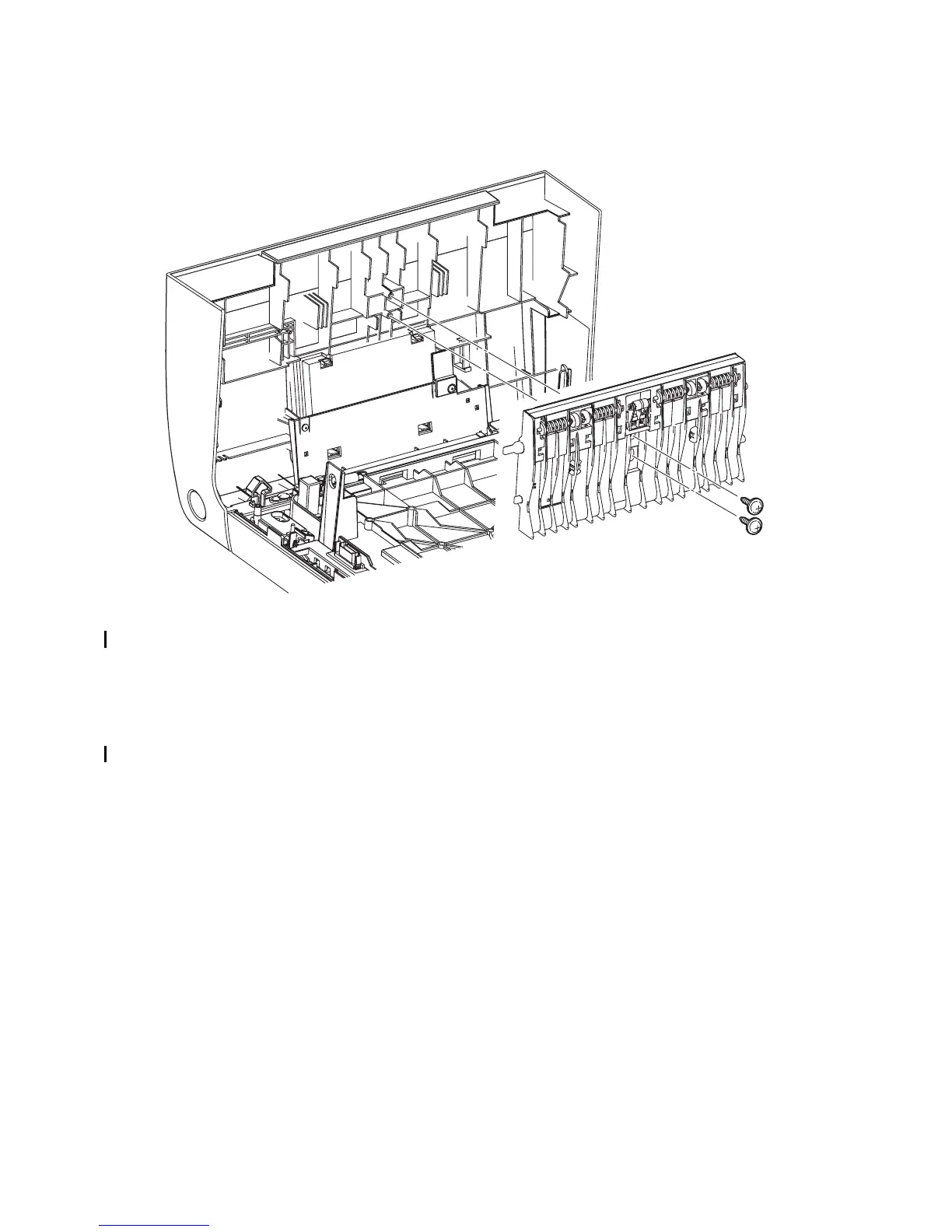 2) Remove two screws (silver, with flange, tap, 10mm) that fix the CHUTE ASSY EXIT OUT
