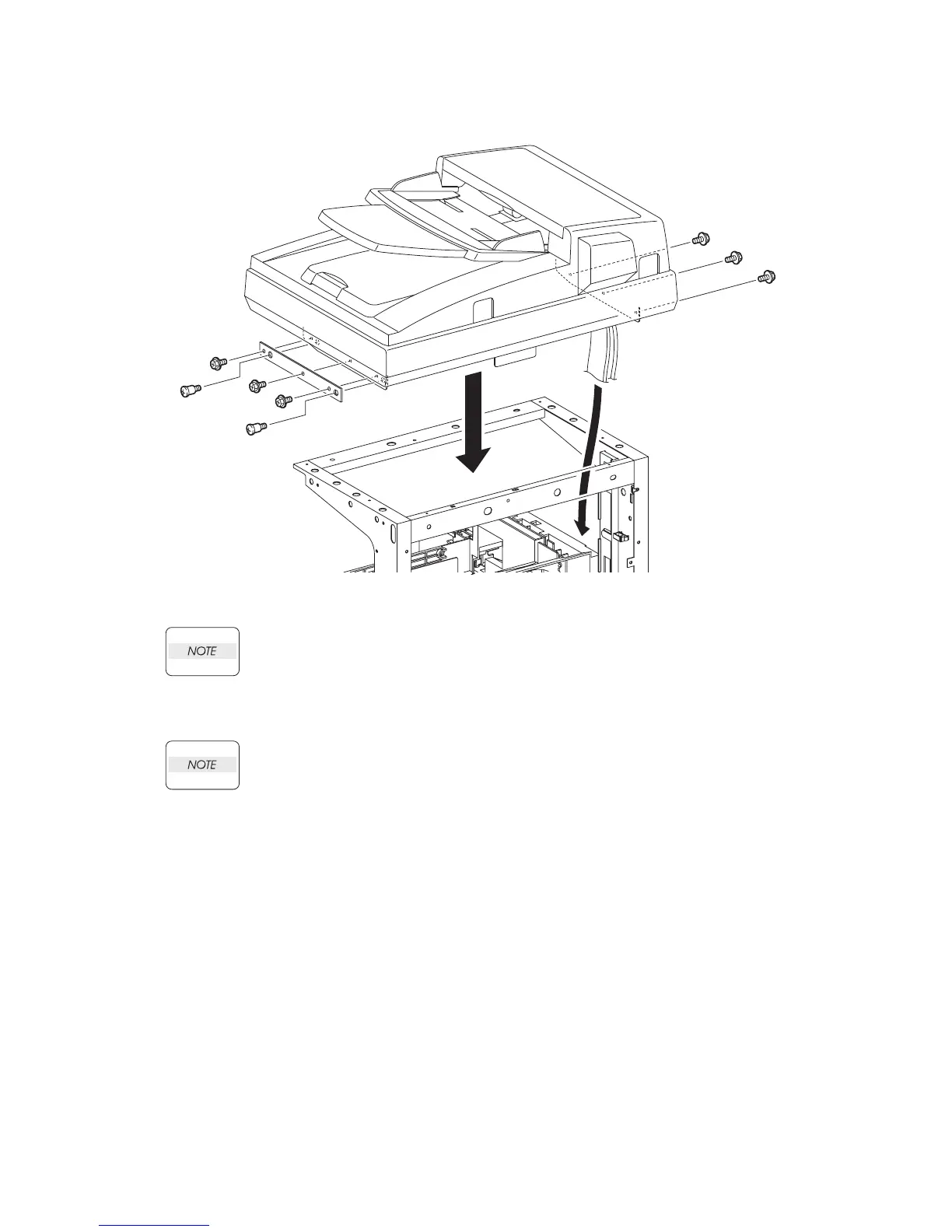 4) Secure the ADF SCANNER ASSY to the printer using the six screws (silver, with flange,