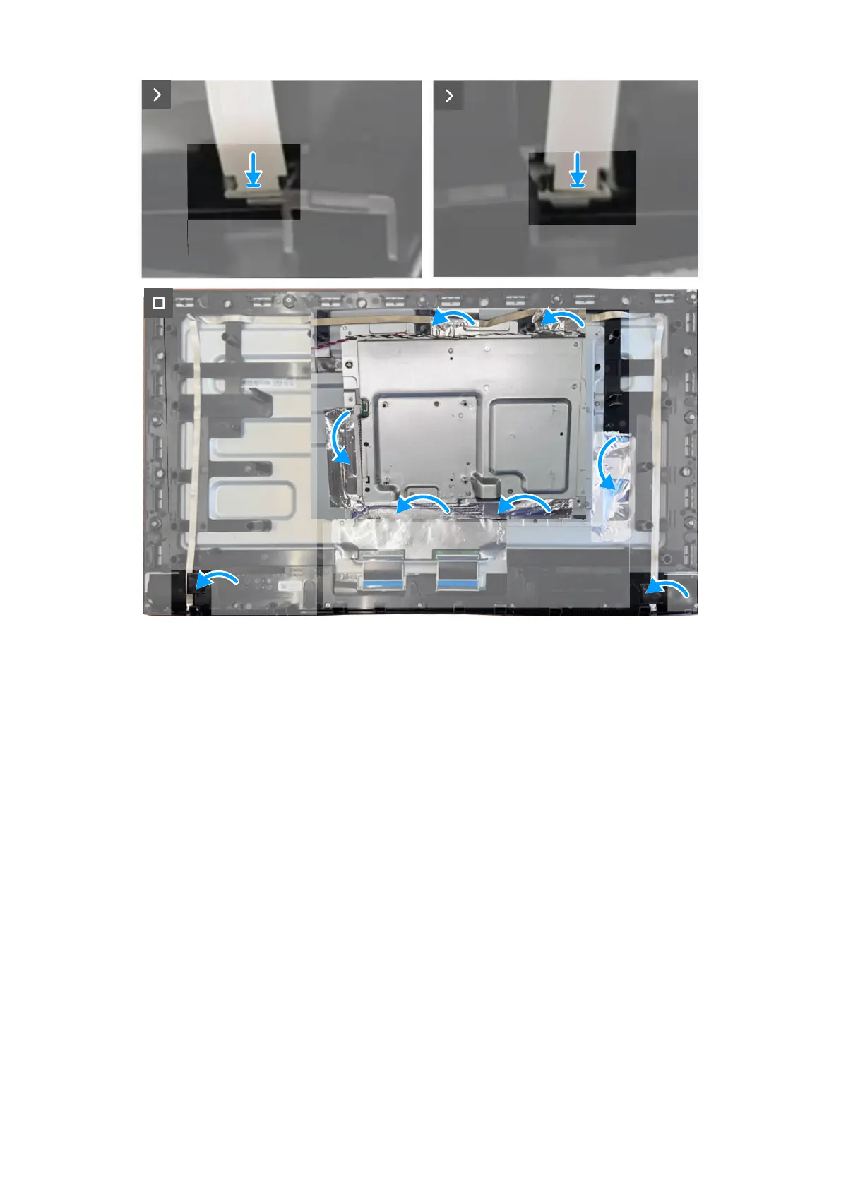 5. Adhere the tapes to secure the lightbar cables and metal shield to the display panel.