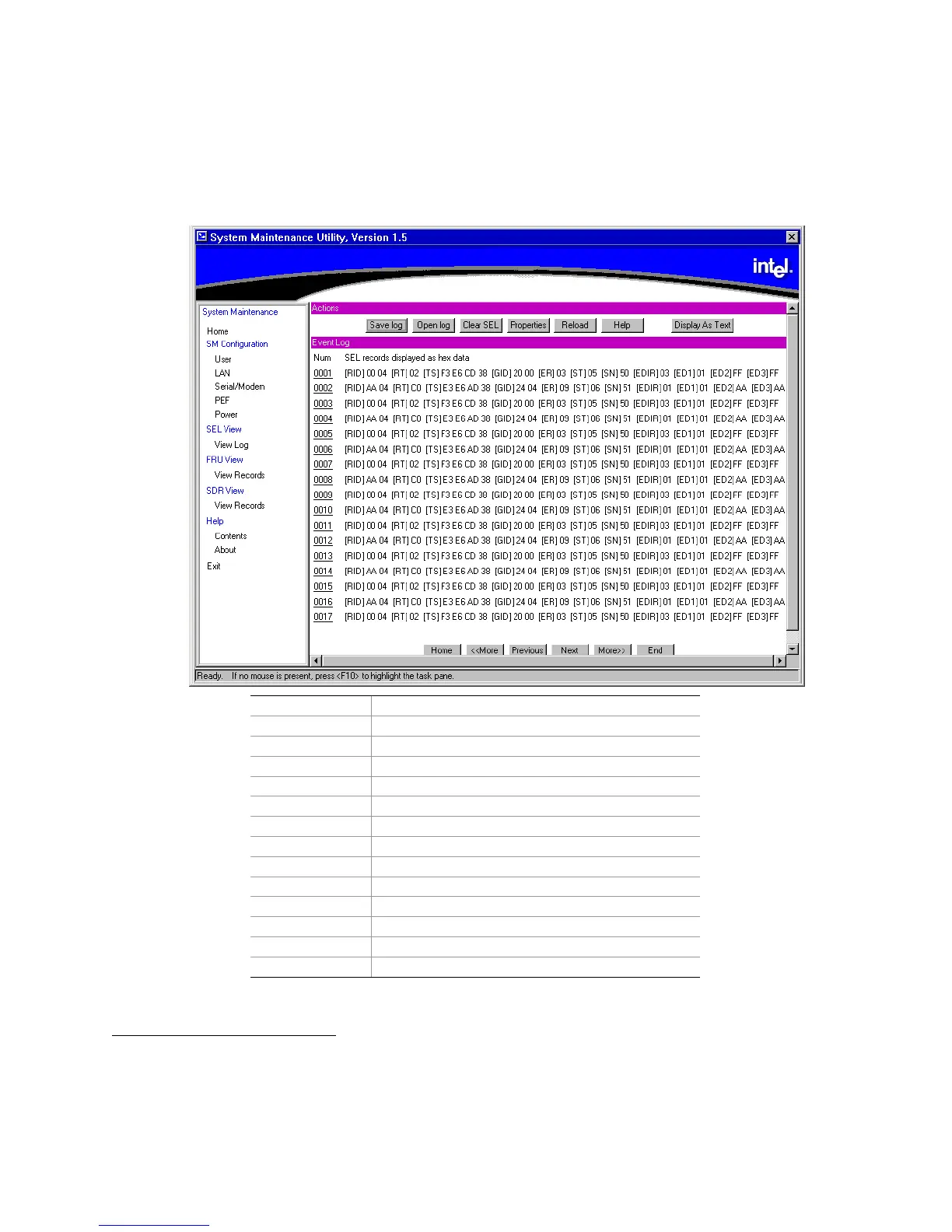 When the SEL Viewer is opened (see Figure 45), the first page of events is loaded from the log and