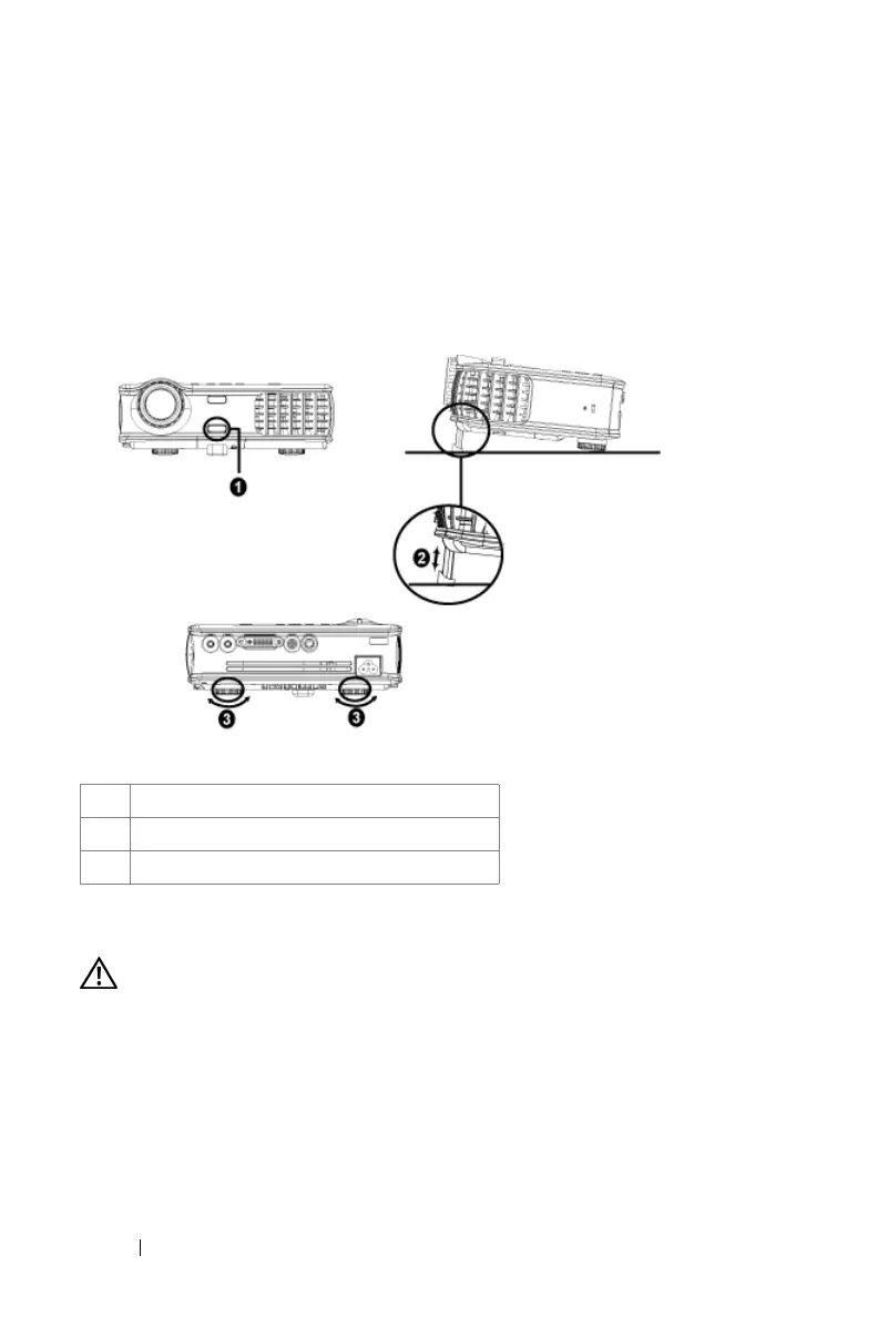将投影仪升高到需要的显示角度,然后松开该按钮将升降支架底脚锁定到位。
