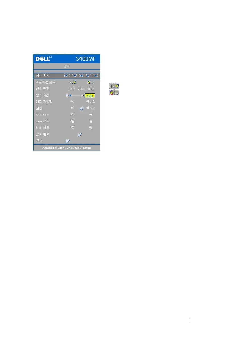 ECO 모드 —켬을 선택하면 낮은 전력 레벨 (136W) 에서 프로젝터를 사용할 수
