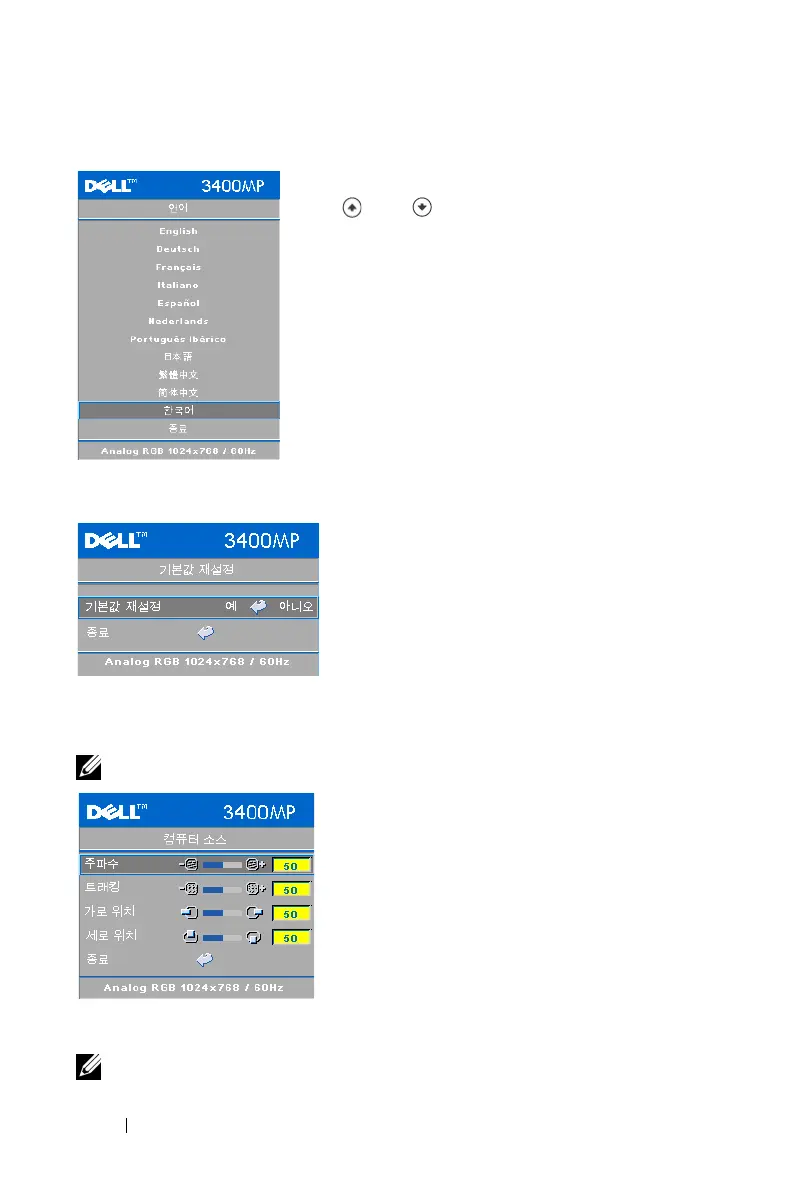 Dell 3400MP - 언어 메뉴; 기본값 재설정 메뉴; 컴퓨터 소스 메뉴