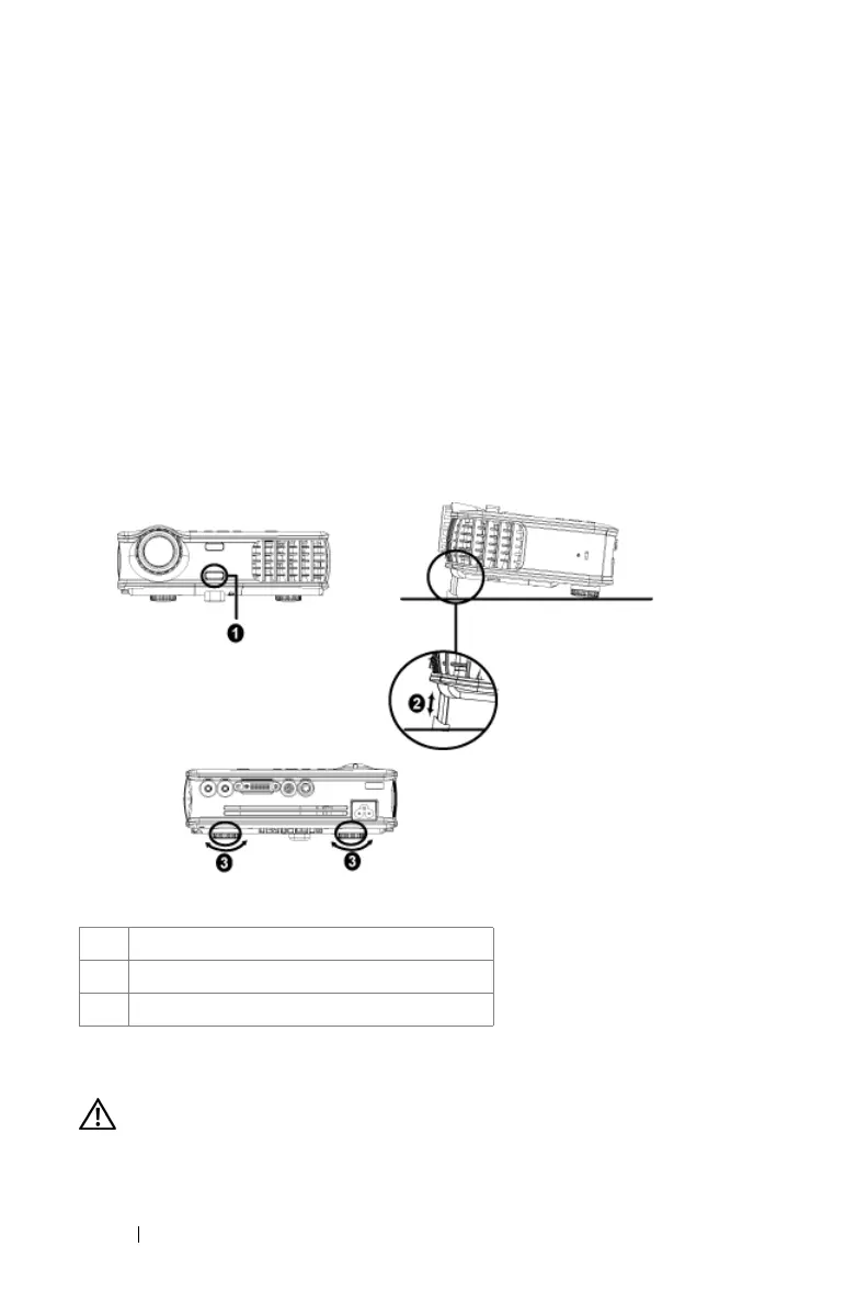 プロジェクタを下げ、ボタンを放し、エレベータフットを固定します。