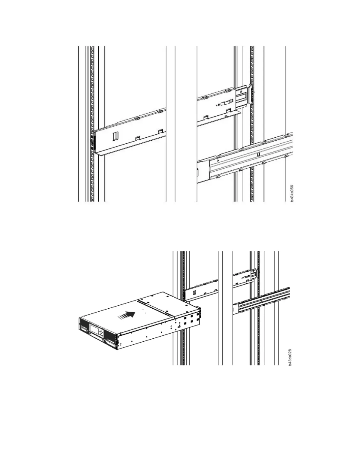 3. Place the library at the front of the rack on the support angles of the rails and push it into the rack to