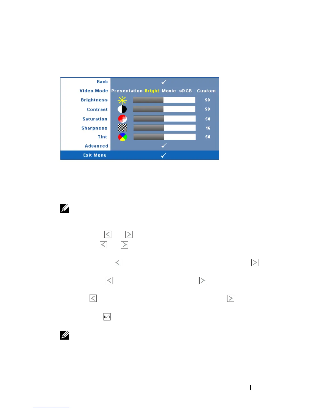 NOTE: If you adjust the settings for Brightness, Contrast, Saturation,
