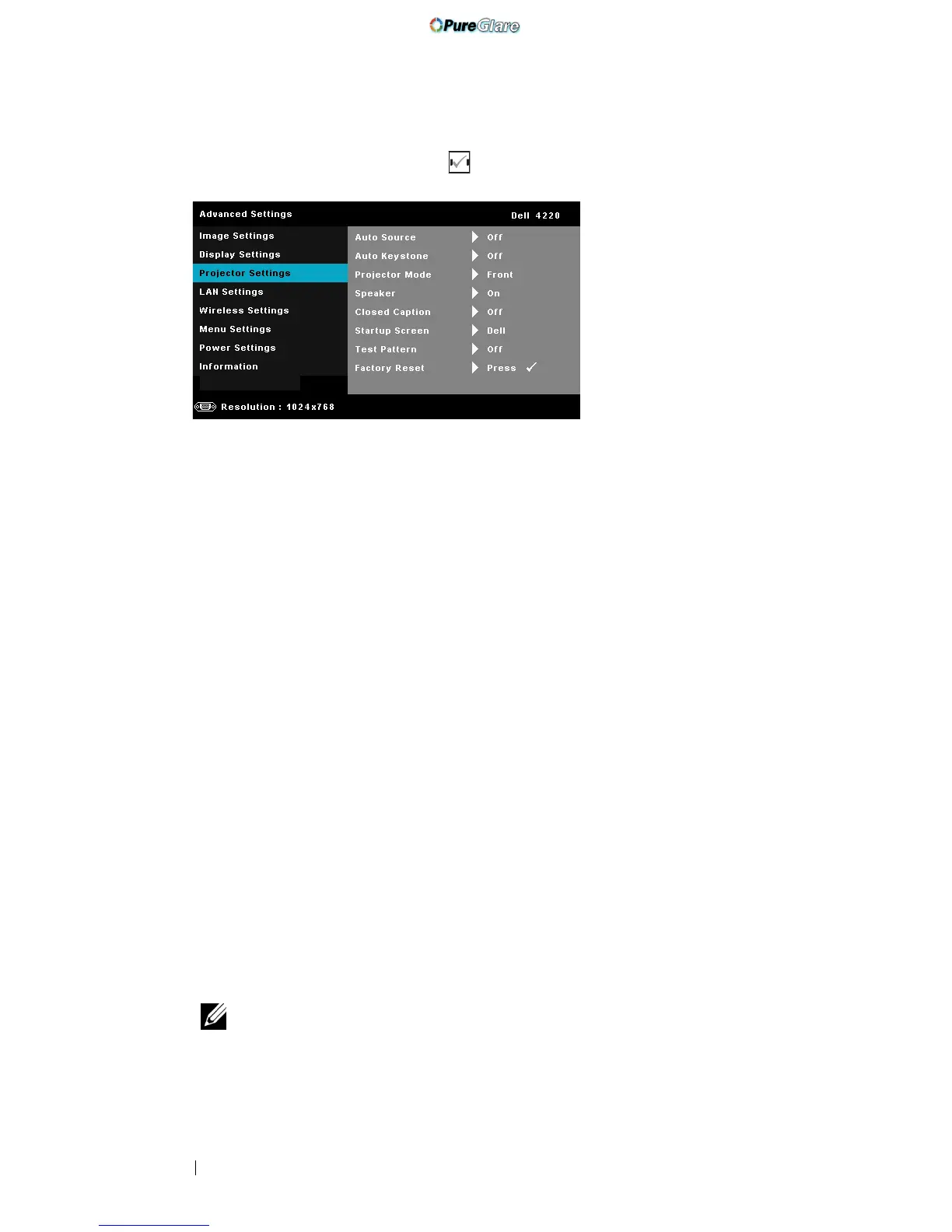 PROJECTOR SETTINGS—Select and press to activate projector settings. The