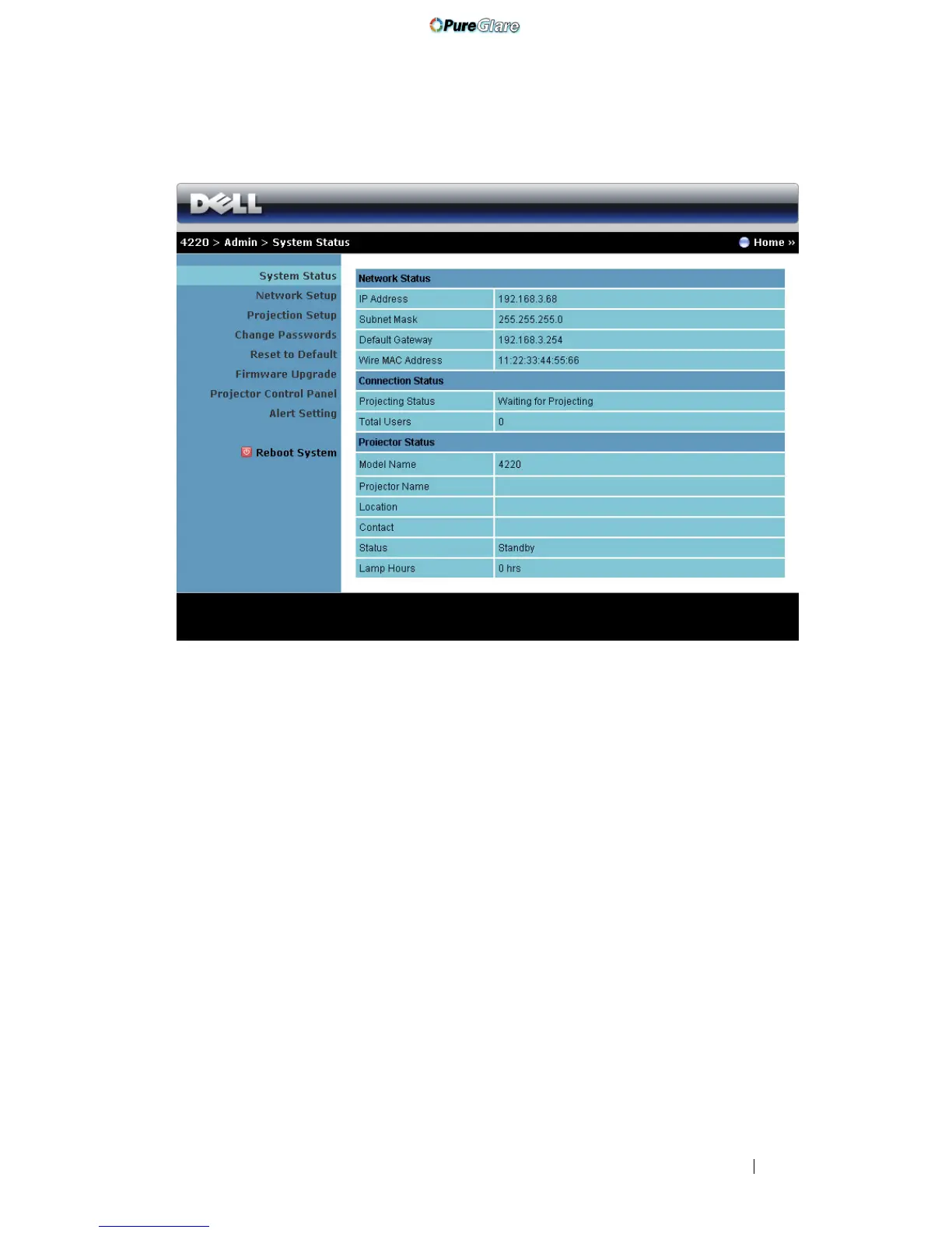 Displays the Network Status, Connection Status, and Projector Status