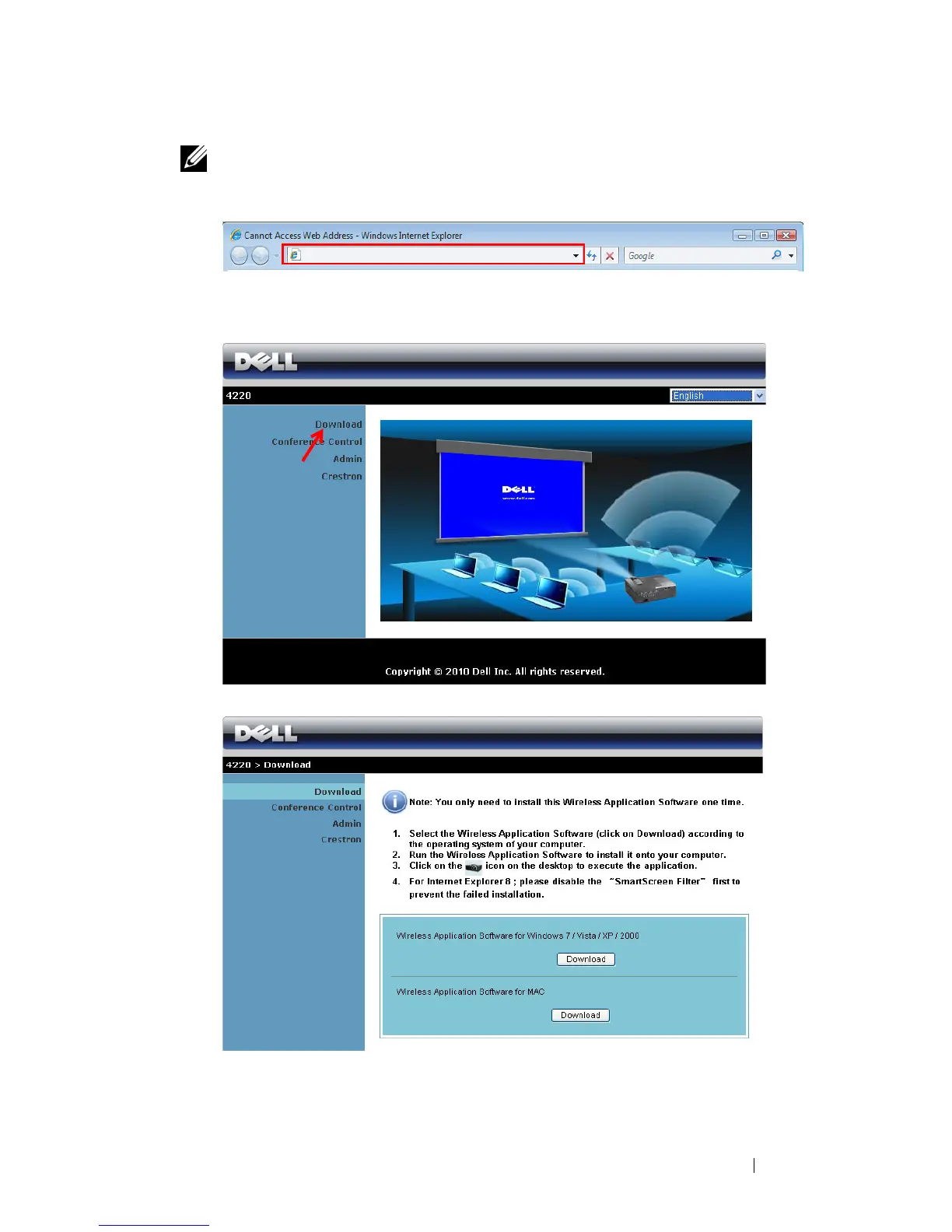 (default IP address is 192.168.100.10) noted from the projector’s screen in the