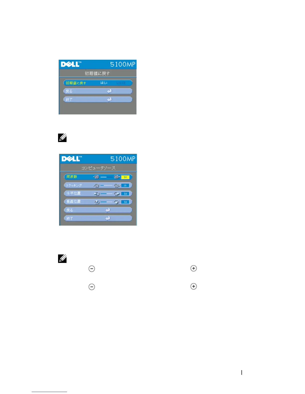 Dell 5100MP - 初期値に戻す メニュー; コンピュータソース メニュー