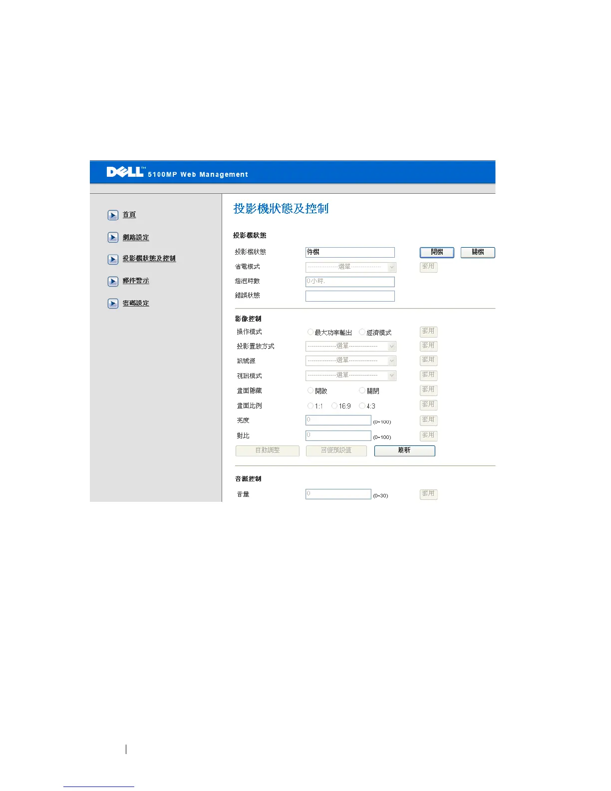 使用投影機狀態與控制來管理投影機的狀態、影像控制和聲音控制。