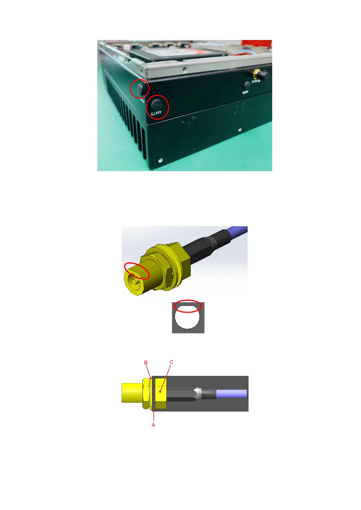 with the flat section of the antenna hole. Position the SMA cable connector so that the sheet metal of the panel is between