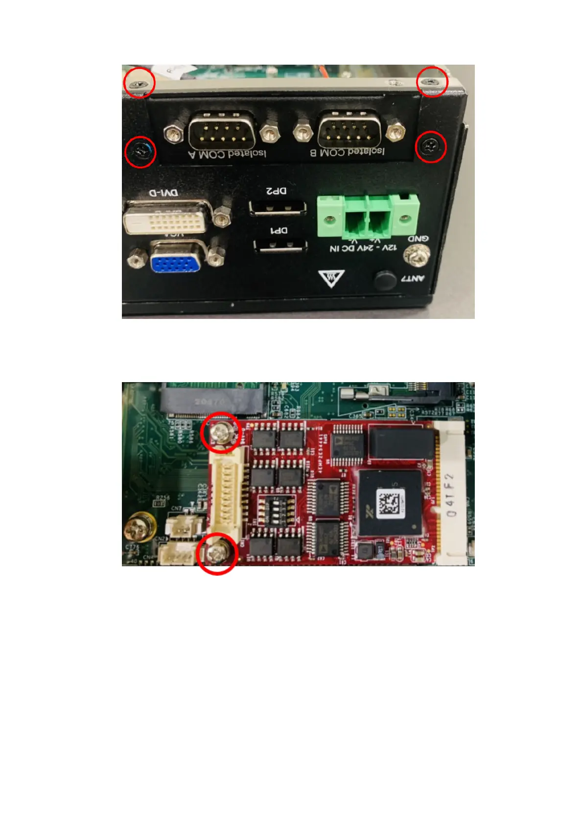 11. Install the Isolated COM mPCIe module on the motherboard. Use the two M2.5 x 6L screws in the corners of the module, as