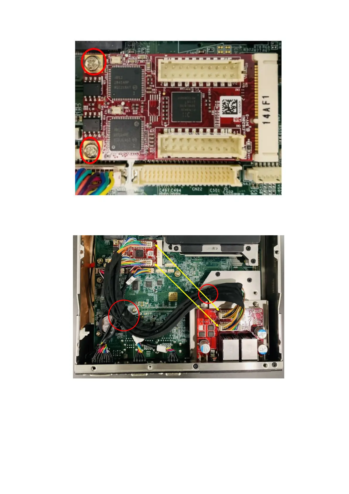 15. Connect the LAN cables from the GbE with PoE module to the mPCIe LAN board. Use cable ties, as shown with red circles