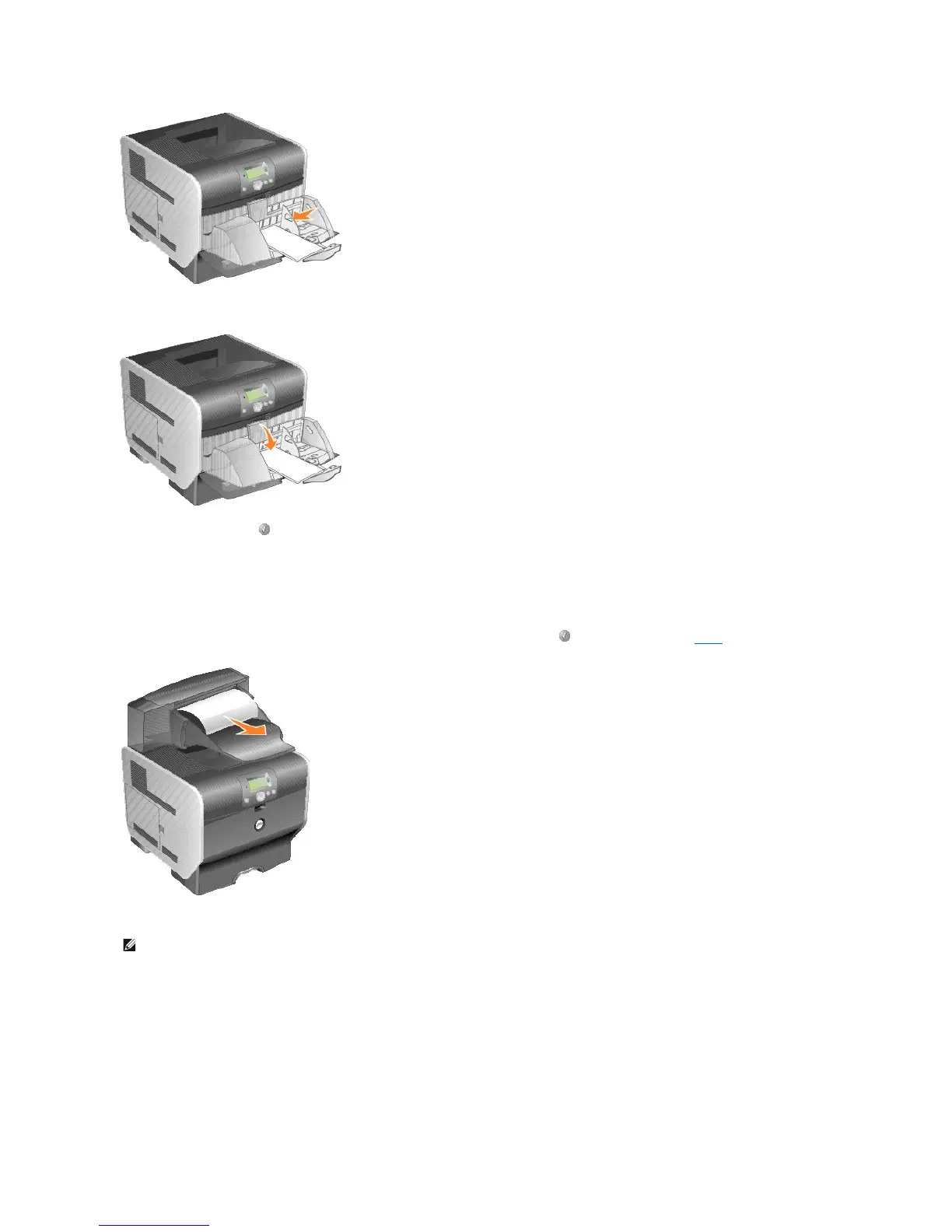 1. If the paper is exiting into the bin, pull the media straight out, and press the Select button . Otherwise, continue with step 2.