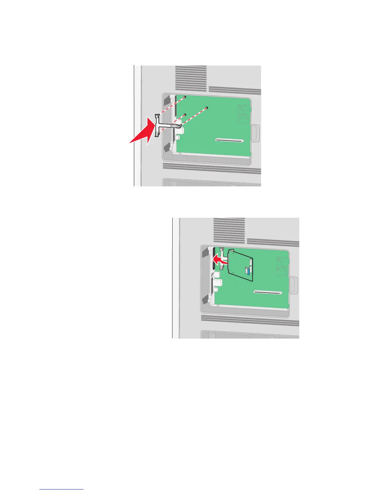 5 Align the posts of the plastic tee to the holes in the system board, and then press downward until the tee snaps