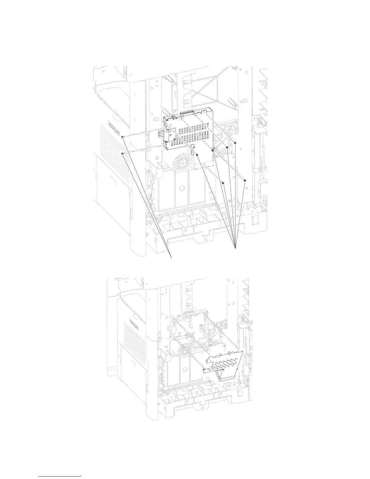 6. Remove eight screws (E) securing the scanner controller cage cover to the cage. An X658 model is