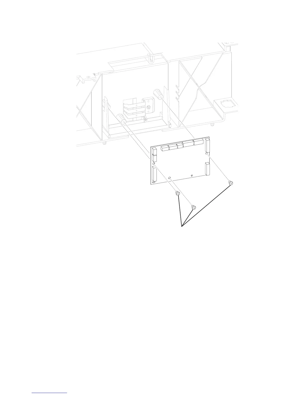 3. Remove the three screws (A) securing the 550-sheet controller card assembly to the 550-sheet frame.