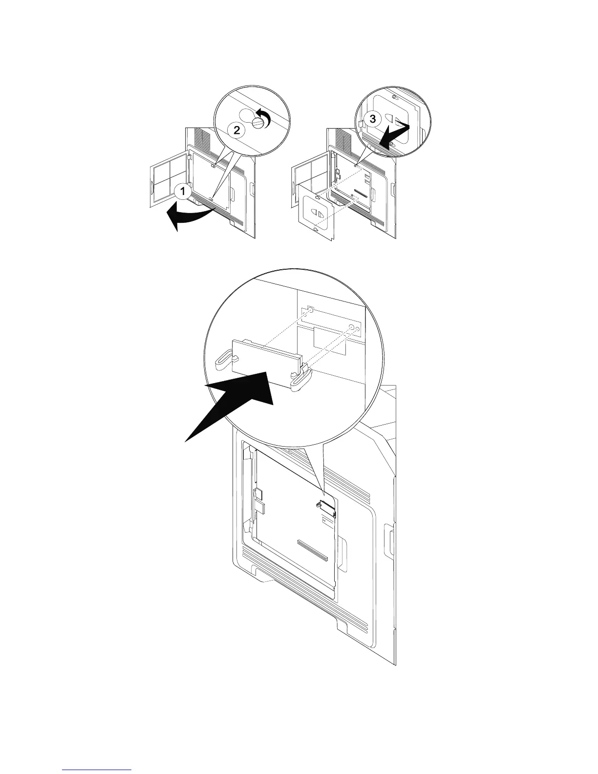 3. Open the system board door, and loosen the screw on the system board cover. Remove the cover.