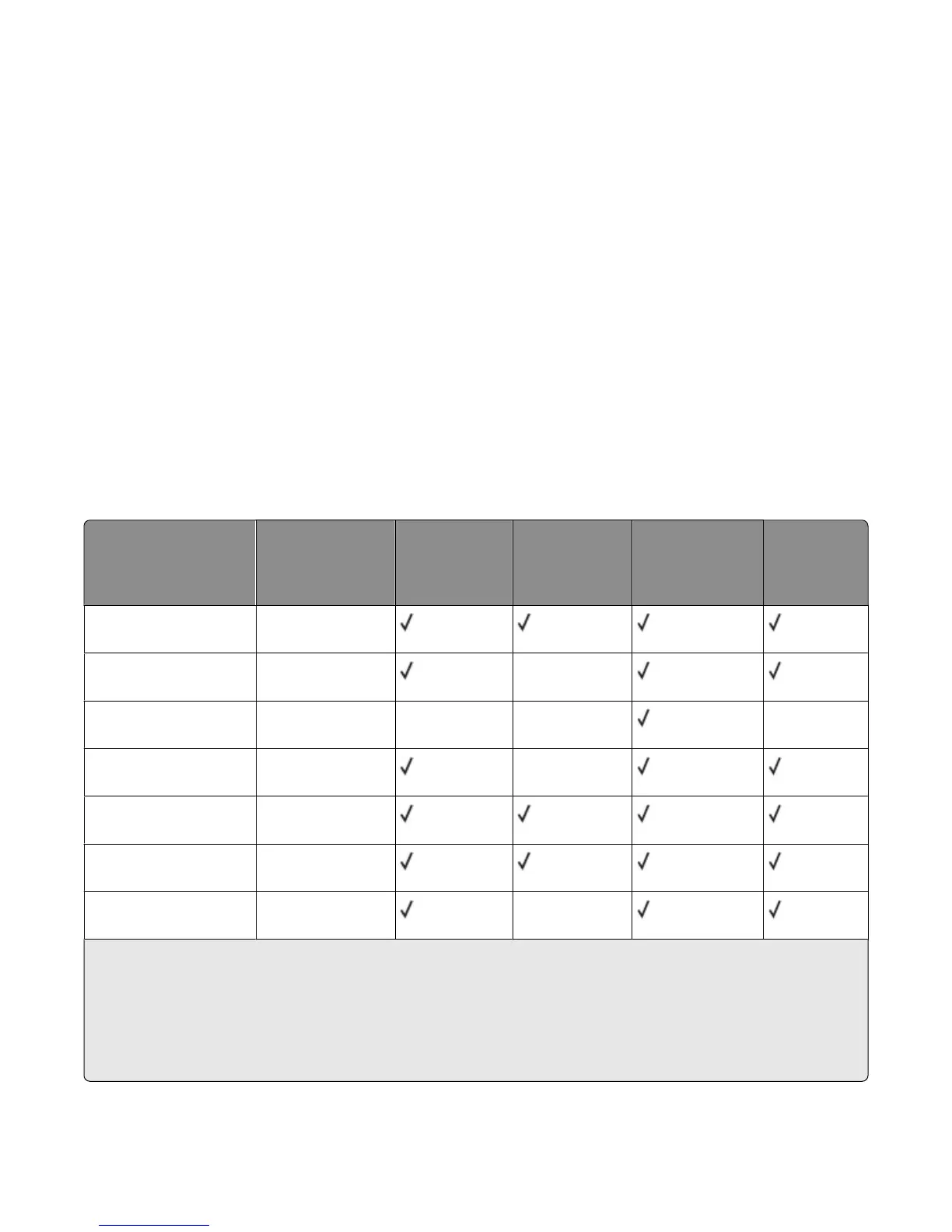 The following tables provide information on standard and optional paper sources and the types of paper they support.