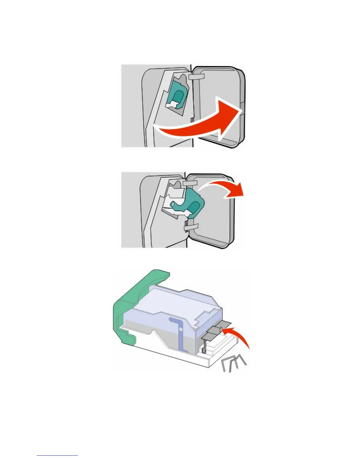 2 Pull the latch of the staple cartridge holder down, and then pull the holder out of the printer.