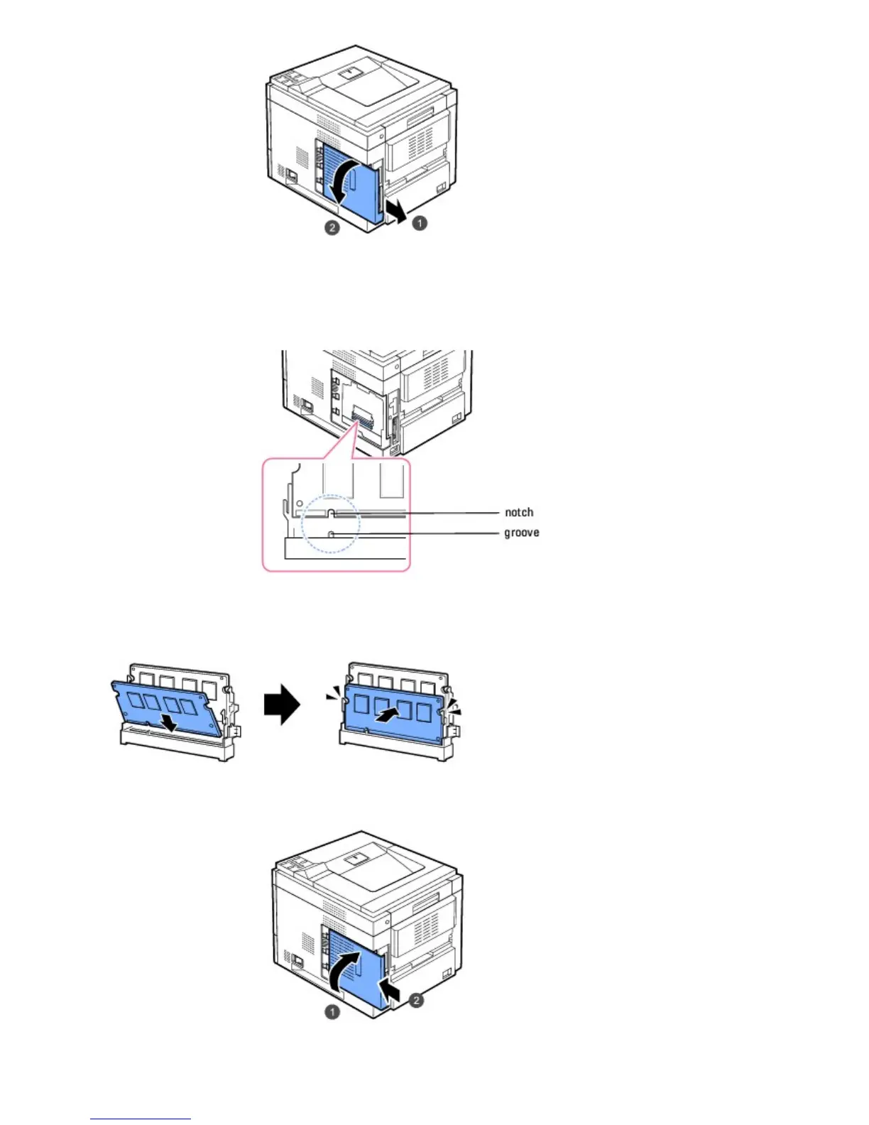 5. Push the DIMM into the printer until it snaps into place. Ensure that the latches fit over the notches located on