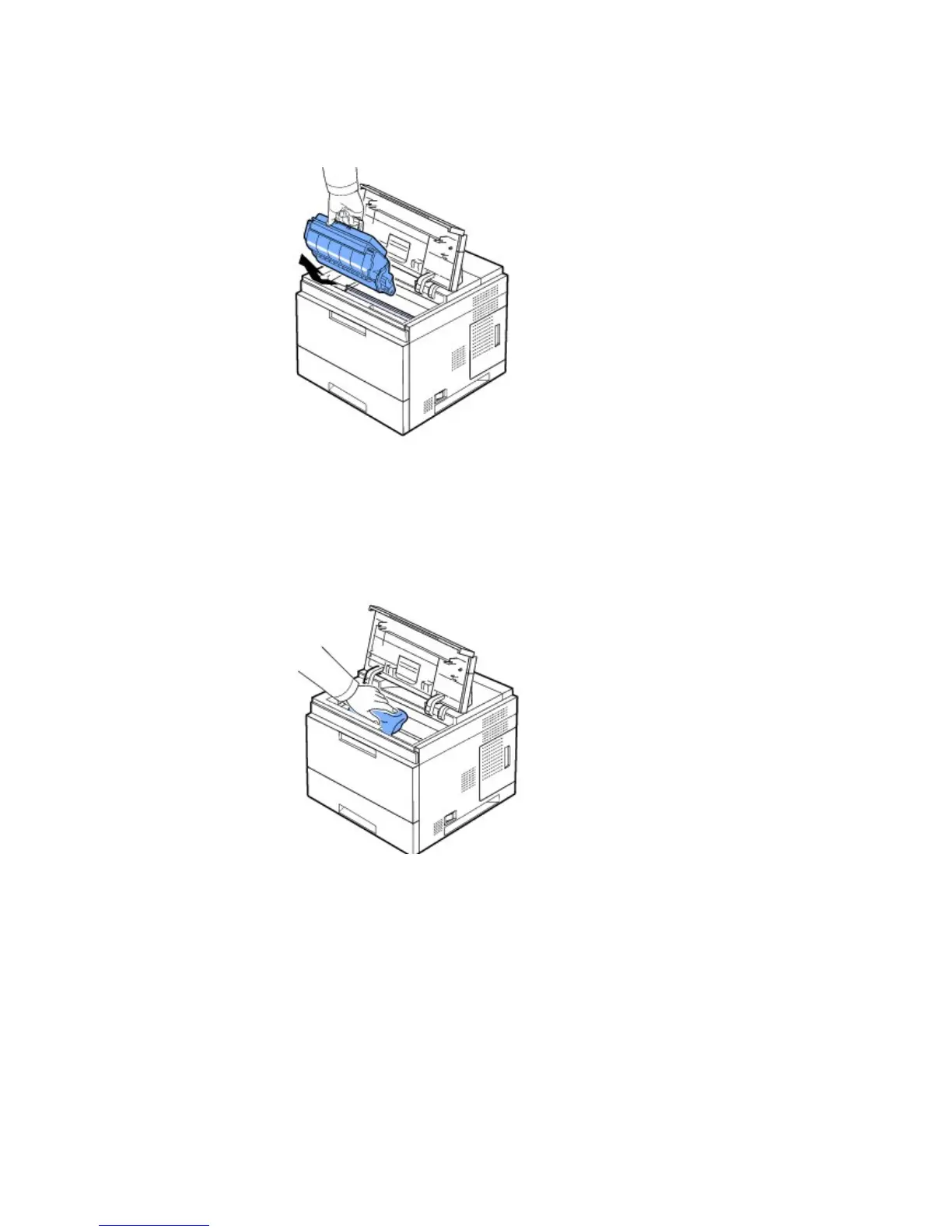 3. With a dry and lint-free cloth, wipe away any dust and spilled toner from the toner cartridge area and from the