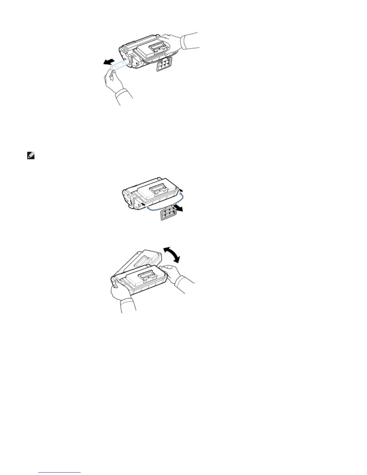 NOTE: Holding the toner cartridge, pull the sealing tape straight to remove it from the cartridge. Be careful not to cut