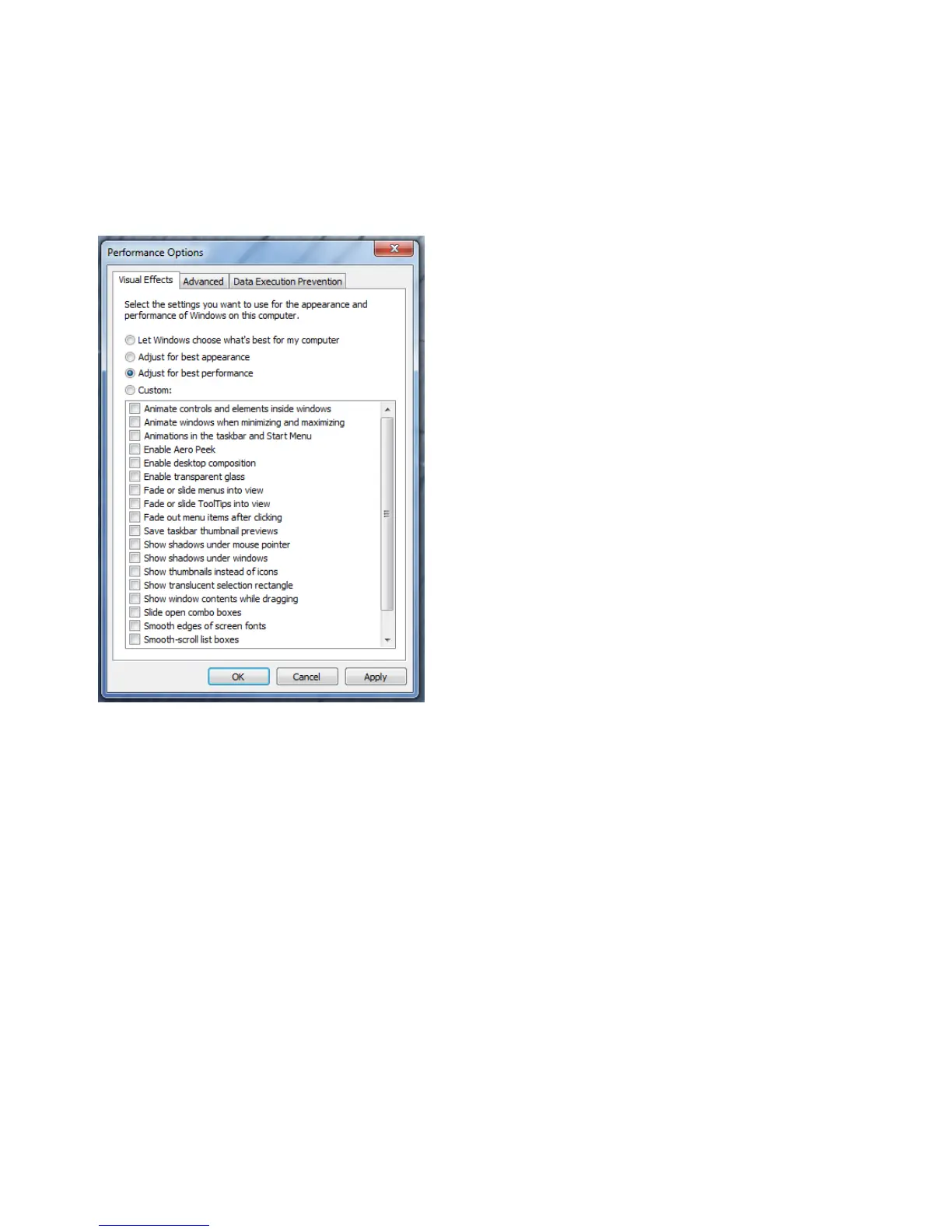 Under the “Visual Effects” tab select the “Adjust for best performance” selection. (Picture below).